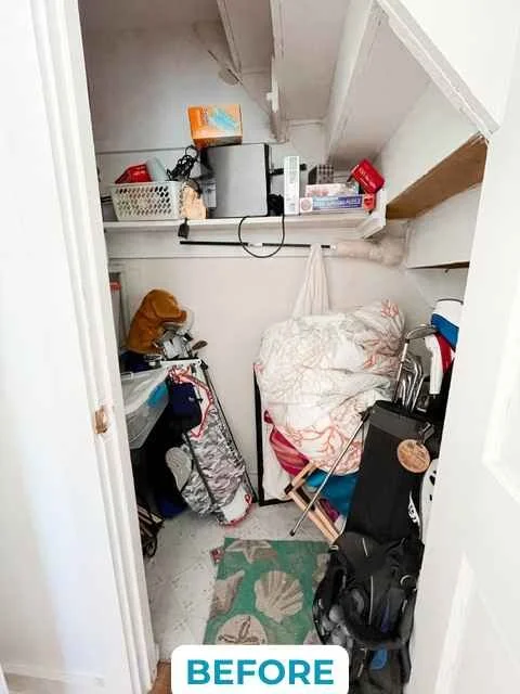 Two Closets, Multiple Purposes. This beautiful historic home in Newport was full of charm and the quirky closet layouts typical of older homes. These two guest room closets, one of them underneath stairs, had a mix of off-season clothes, beach gear, sports gear, bedding and miscellaneous items. Decluttering, categorizing, swapping items between the two, and using existing storage items maximized each closet’s storage and gave each a clear (multi) purpose.